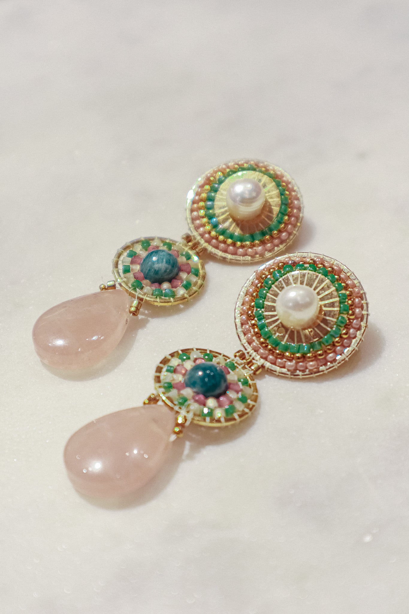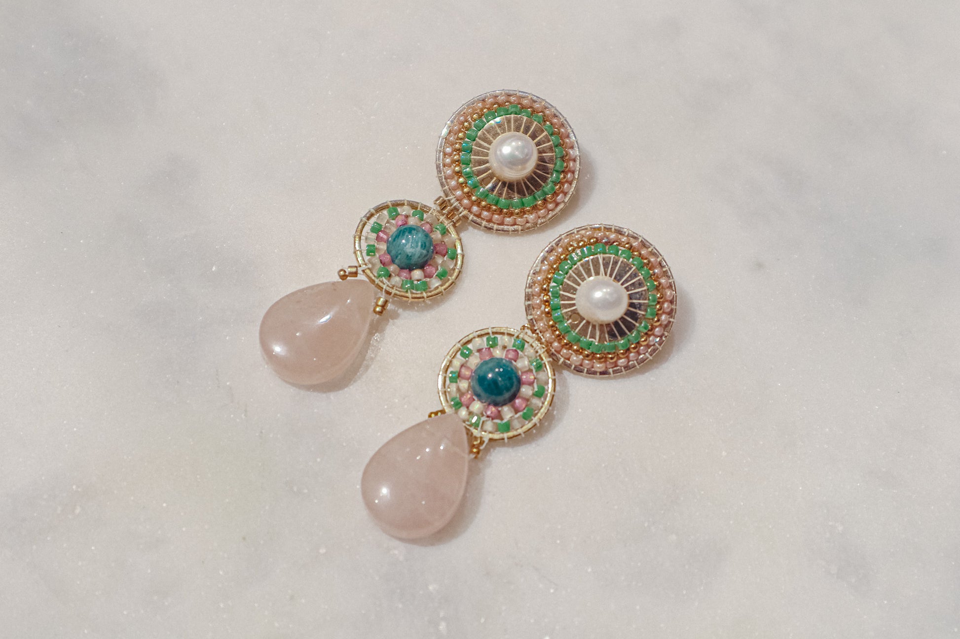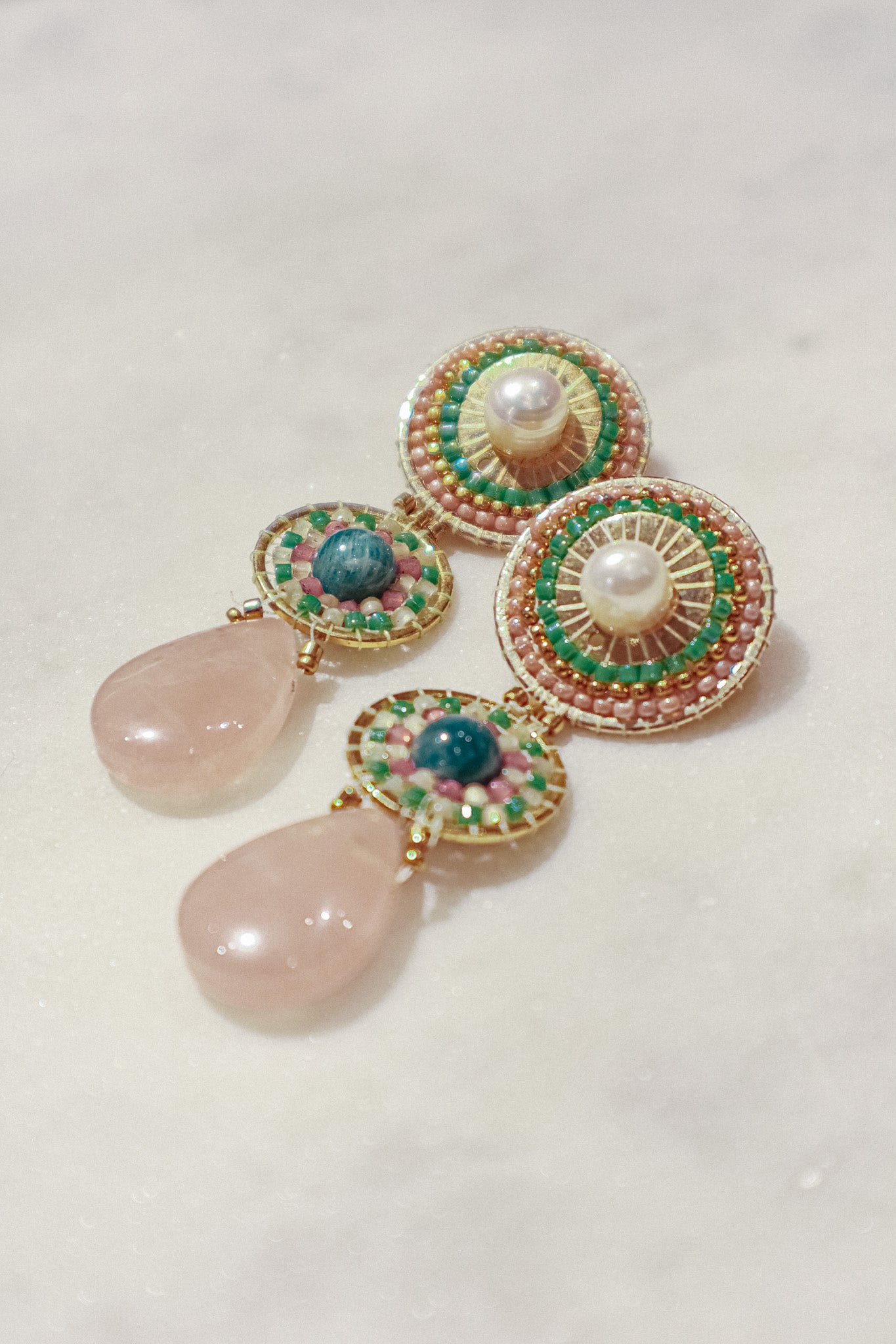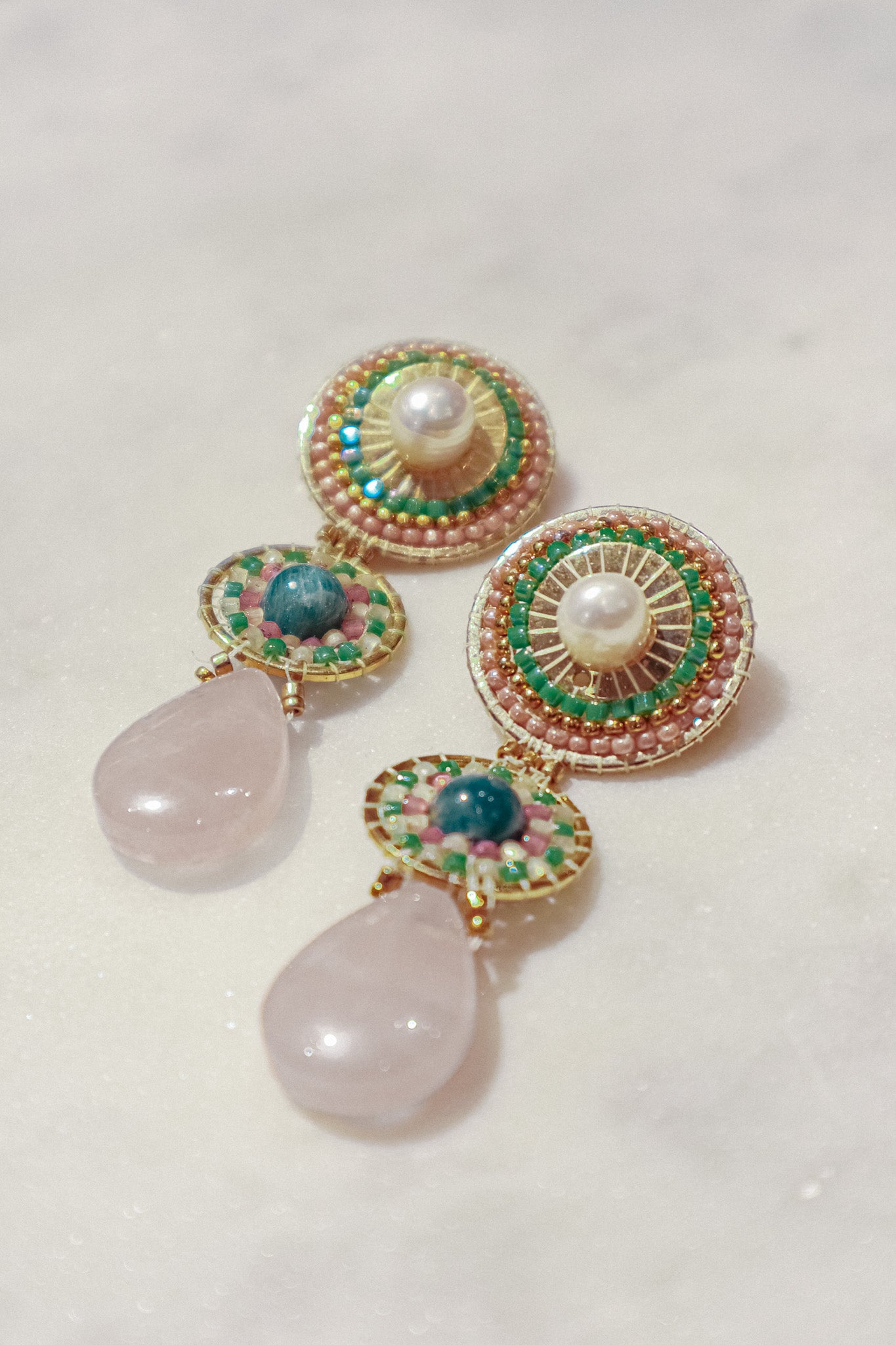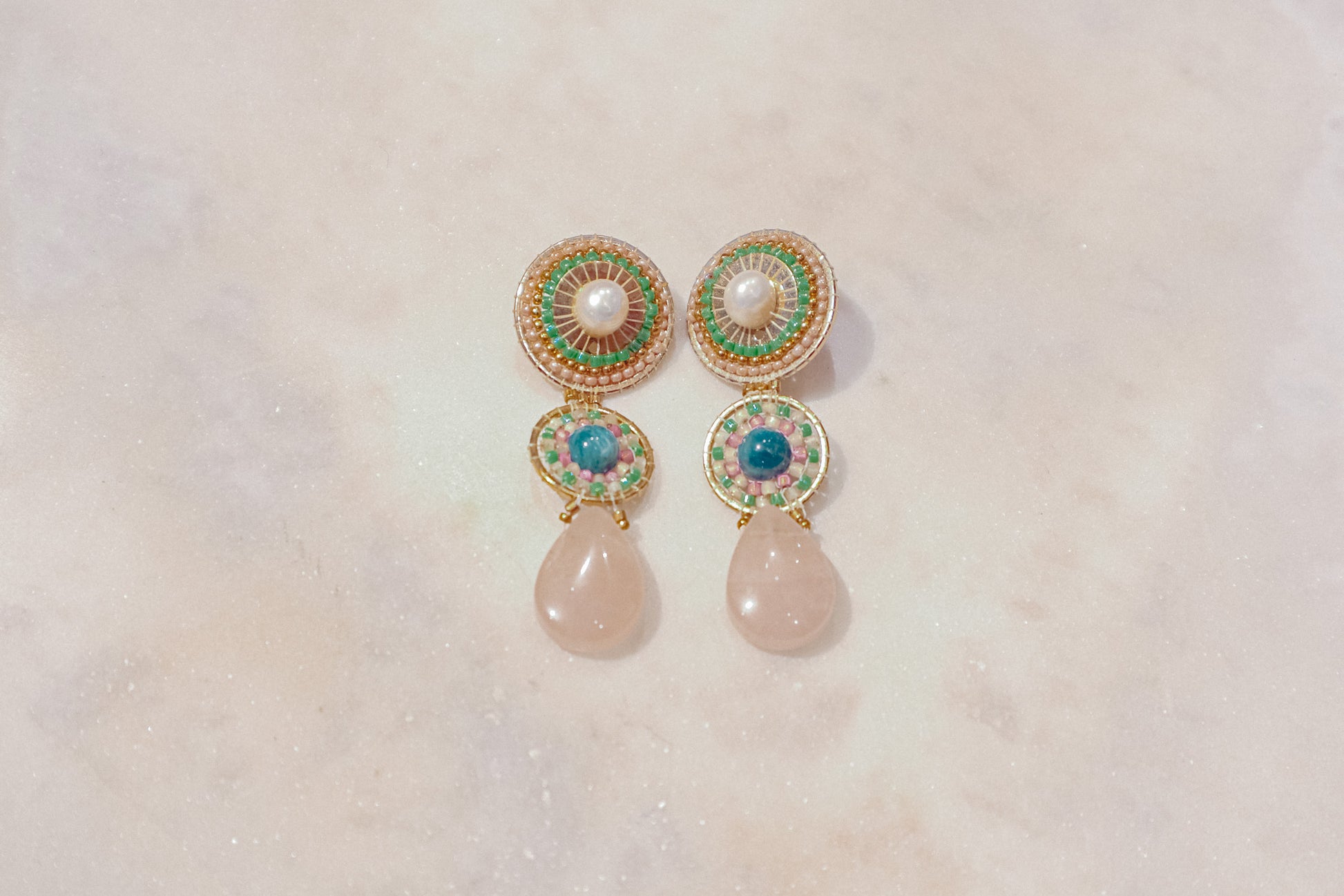Freshwater pearls' classic elegance meets the captivating blue of kyanite and the gentle pink of rose quartz drops on this set of earrings. This enchanting combination rests on polished gold-filled findings.