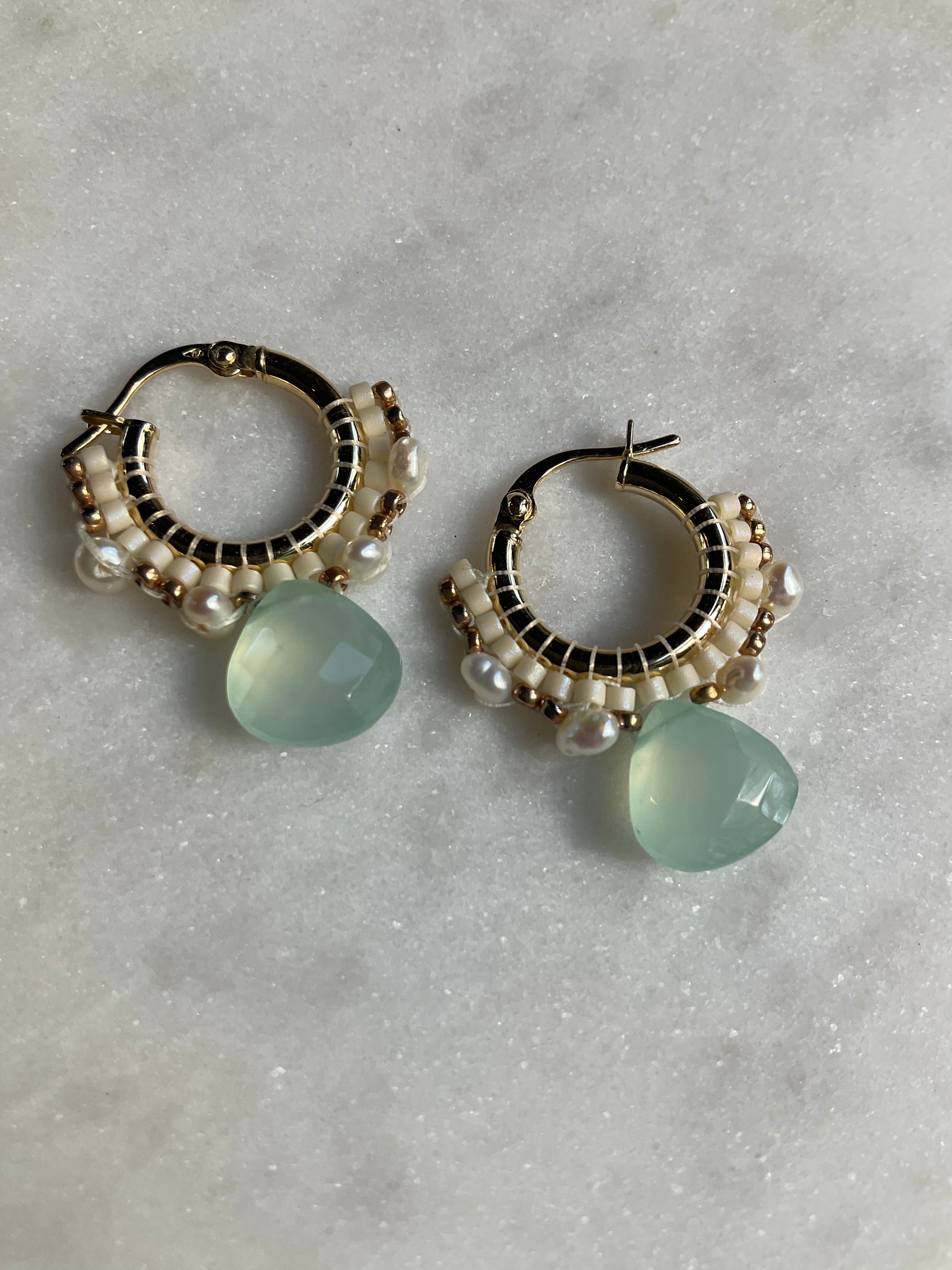 18K solid gold mini hoops with Keishi pearls and Chalcedony drops with Miyuki beads handwoven all around.